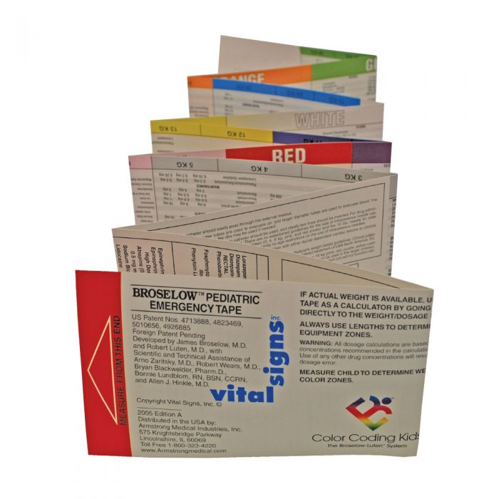 Children vary a great deal in size and the opportunities for a medic to get in depth experience across the whole range is limited. The Broselow/Hinkle system helps to bridge the gap. A reference at each color bar on the tape informs you of equipment sizes to perform emergency resuscitation on the child. A reference at each weight zone on the tape shows pre-calculated medication dosages and infusion rates.