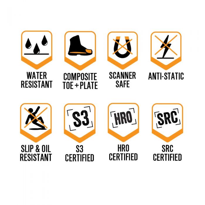- Tested & Certified to European Standard EN ISO 20345:2011 S3 HRO WR SRC